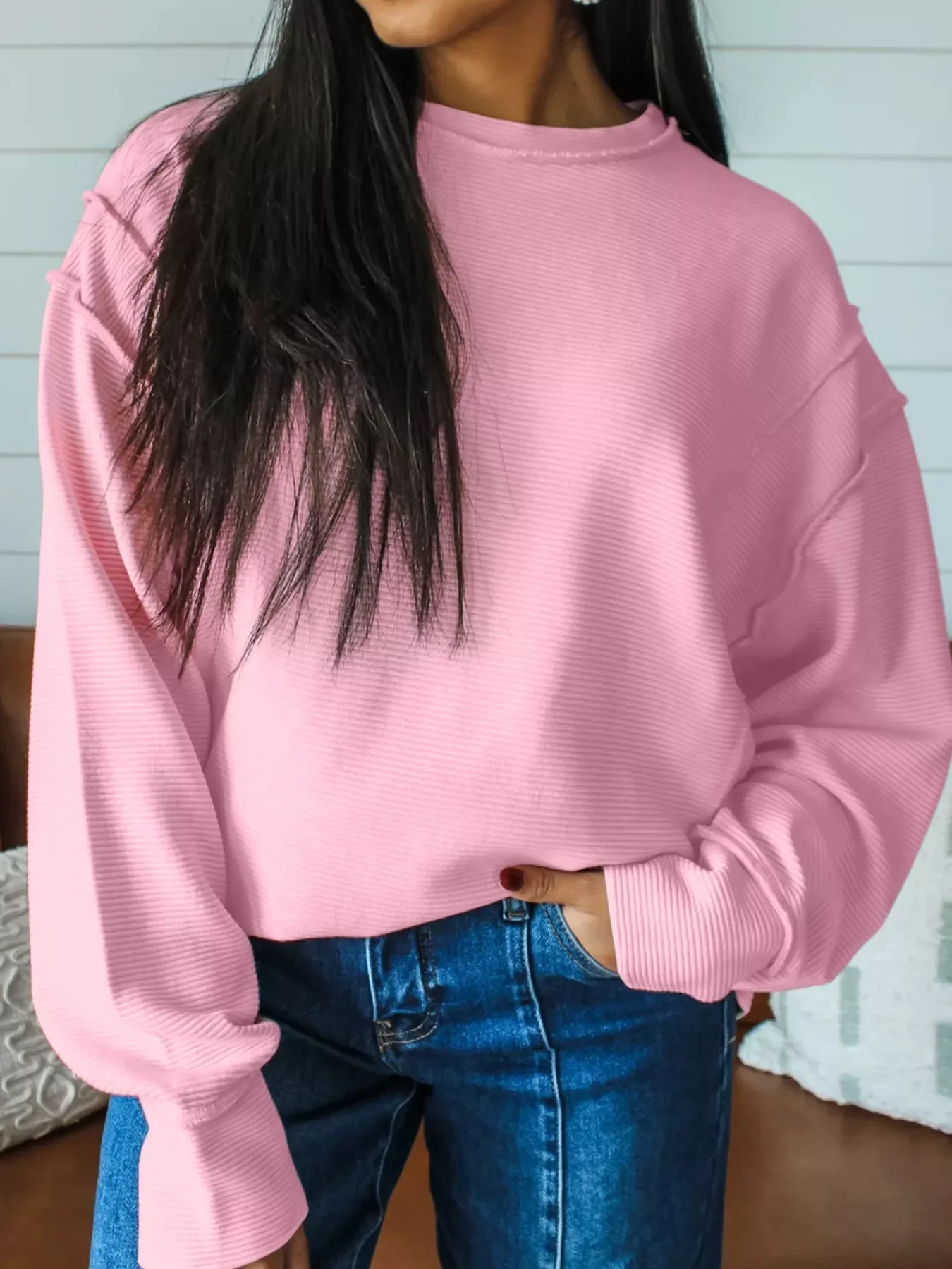 Blush Pink Horizontal Ribbed Drop Shoulder Baggy Pullover – Exposed Seam Detail